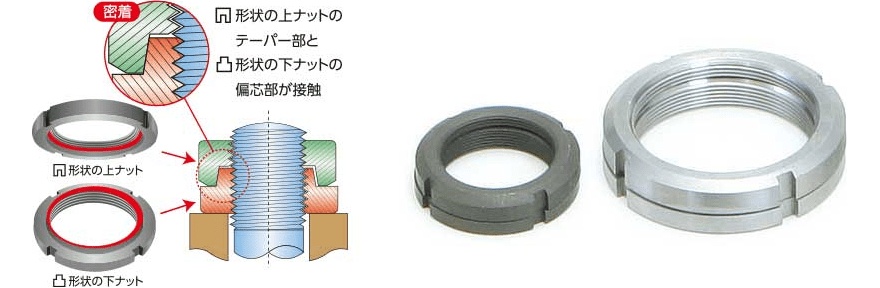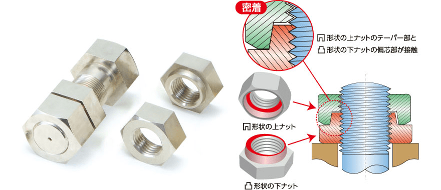 先に凸ナットをボルトにセッティングした後に凹ナットを凸ナットに向かって締め込んでいくと凹ナットのテーパー部が凸ナットの偏心部へ接した時より、強力な緩み止め効果が発揮される仕組みとなっております。